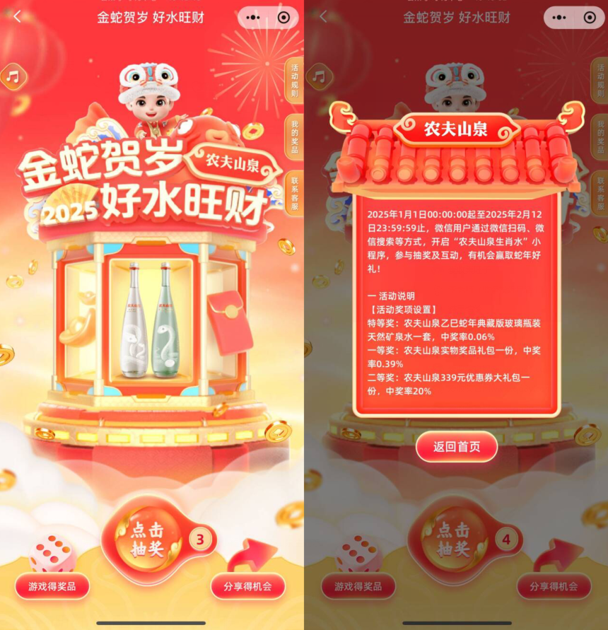 一年一度的农夫山泉抽生肖典藏水来啦微信进入小程序“农夫山泉生肖水”->每天默认3次机会+浏览得5次机会->抽中玻璃瓶天然矿泉水填写地址等邮寄就可以了