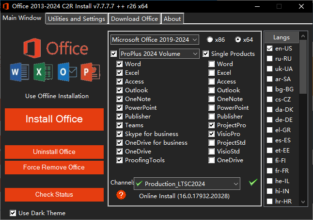 Office 2013-2024 C2R Install是一款免费的Office安装程序,专为支持网络安装和重新安装Office而设计,可以帮助用户在更短的时间内,以最小的安装文件体积安装Office。