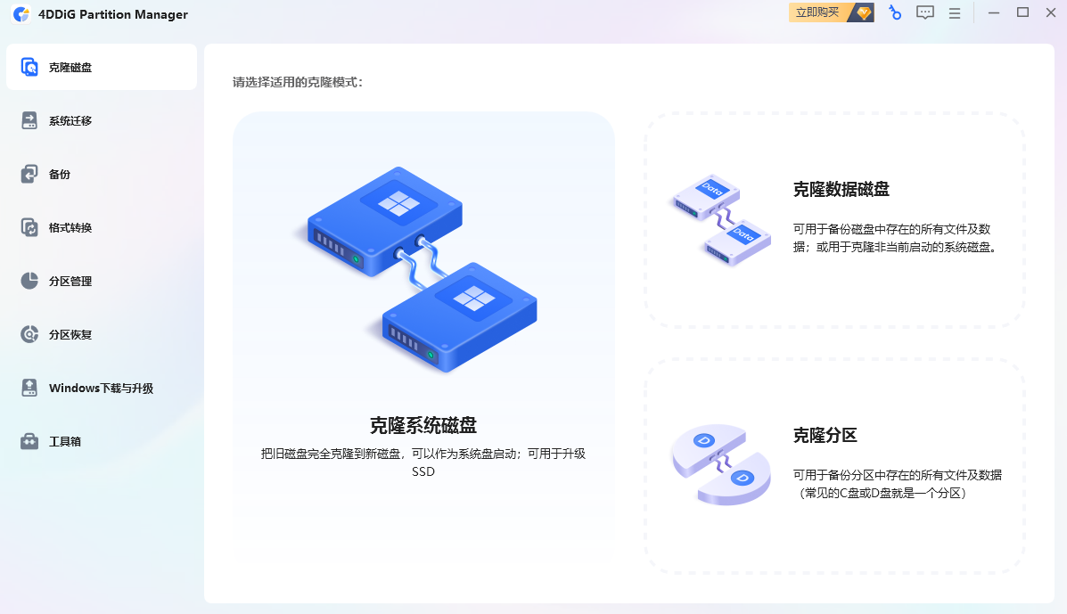 4DDiG Partition Manager一款功能全面的磁盘分区管理工具,支持Windows系统(包括Windows 11/10/8.1/8/7),提供分区调整、磁盘克隆、系统迁移、数据恢复等核心功能。它以直观的界面和高效的操作著称,即使是非技术人员也能轻松完成复杂的磁盘管理任务,如迁移系统到SSD、优化存储空间或备份数据。